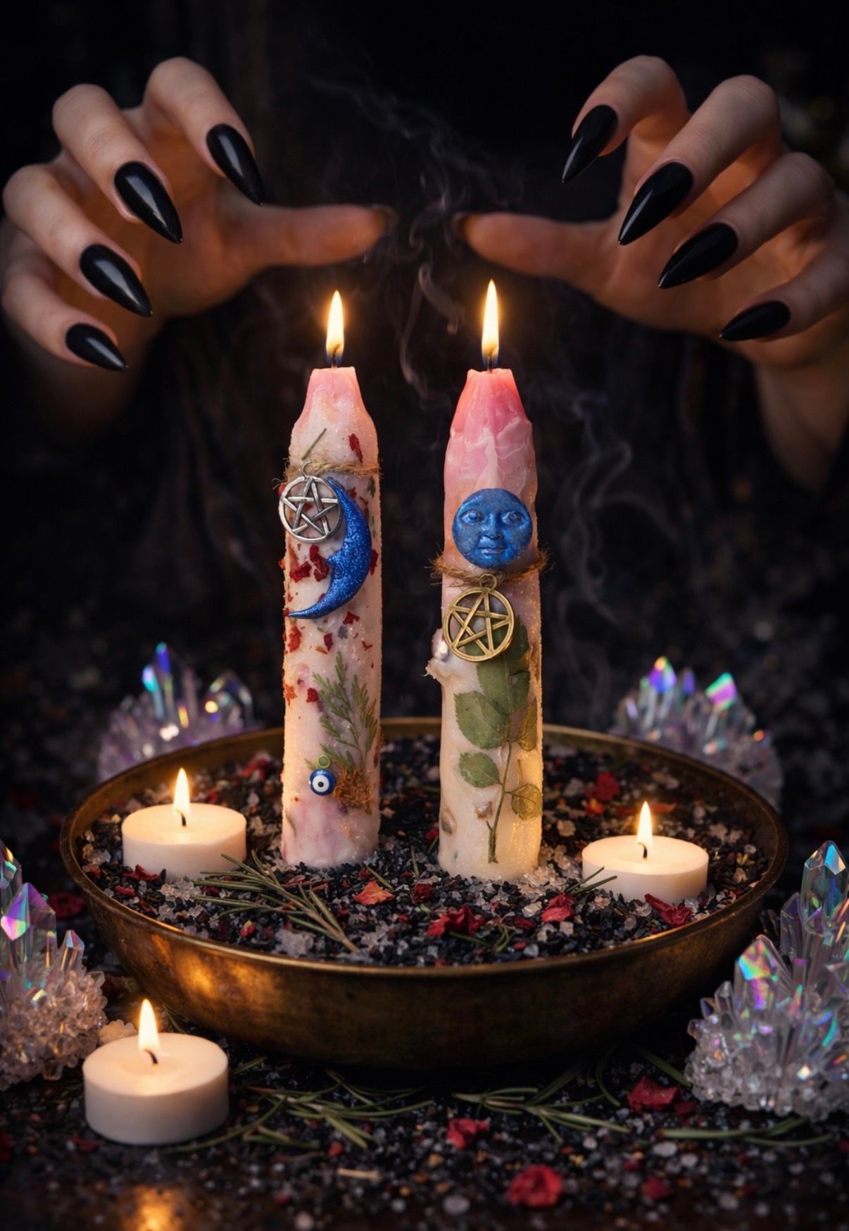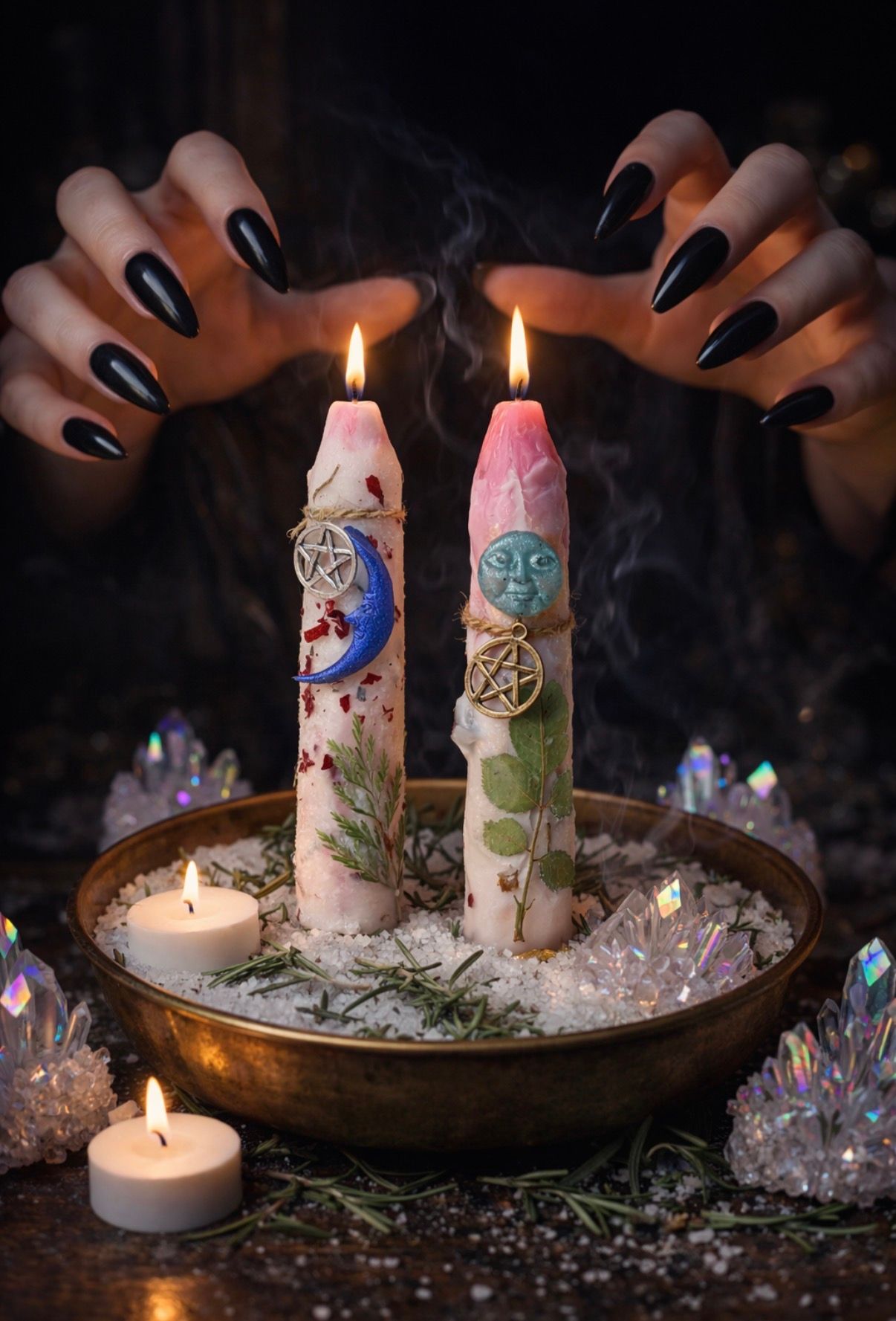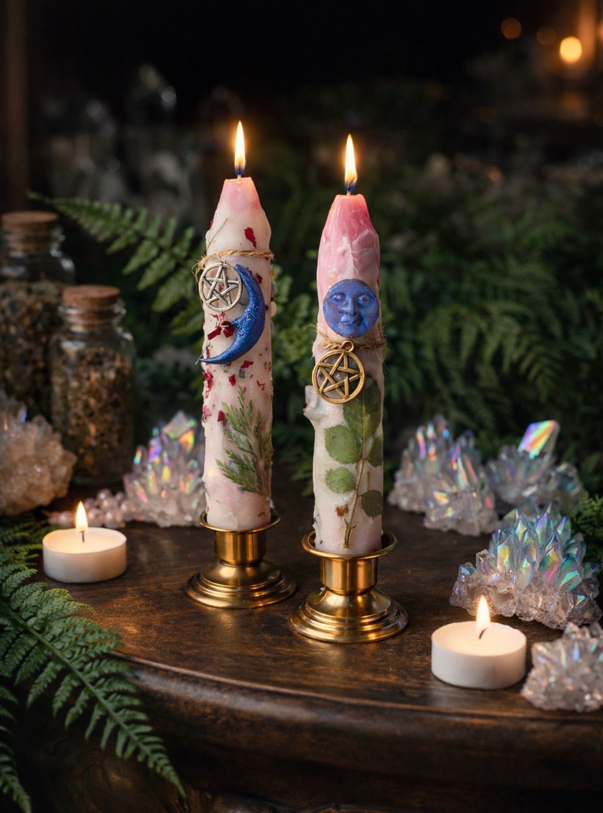 These hand-rolled ritual candles are infused, dressed, and sealed with purpose. Each one is dipped in wax blended with protection oil, layered with pressed foliage, and finished with powerful symbolic elements — including pentagram charms for protection and balance, or evil eye charms to deflect negativity. Moon accents amplify intuition and spiritual strength.