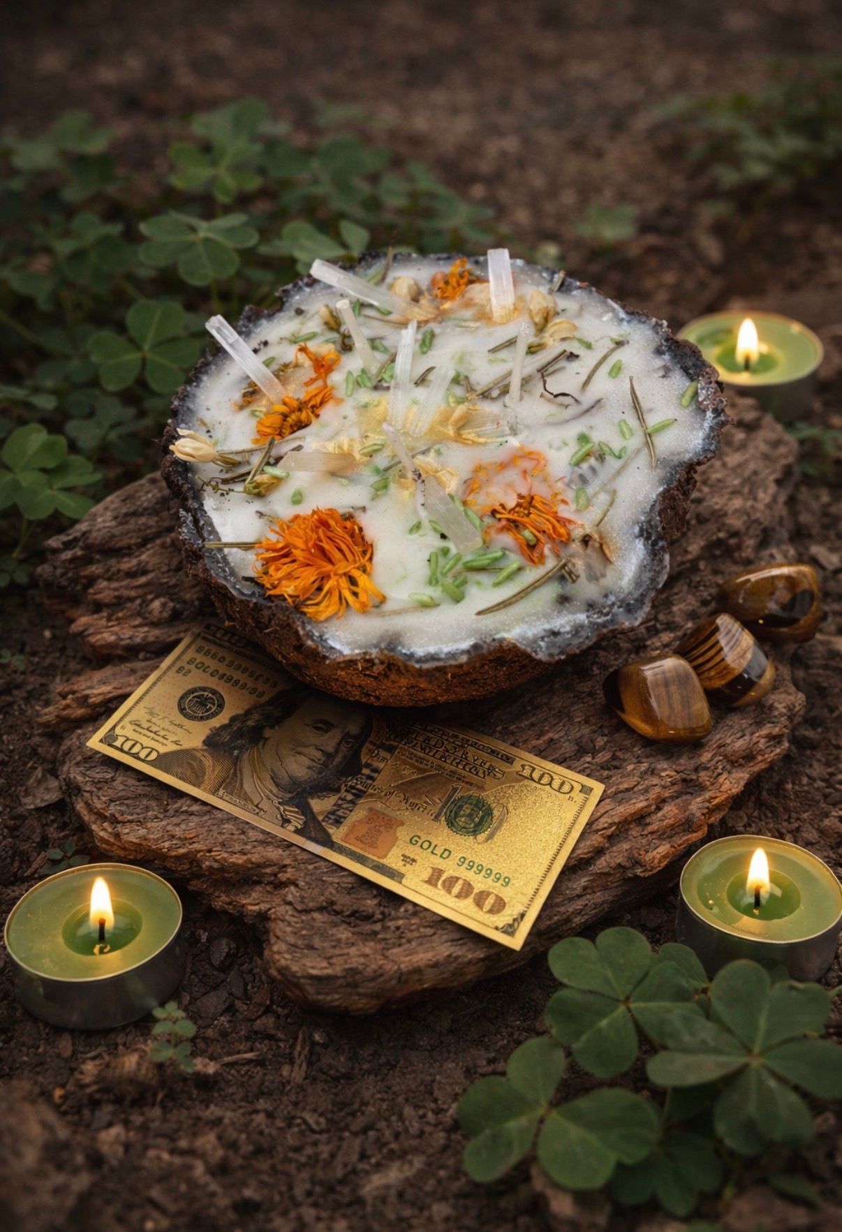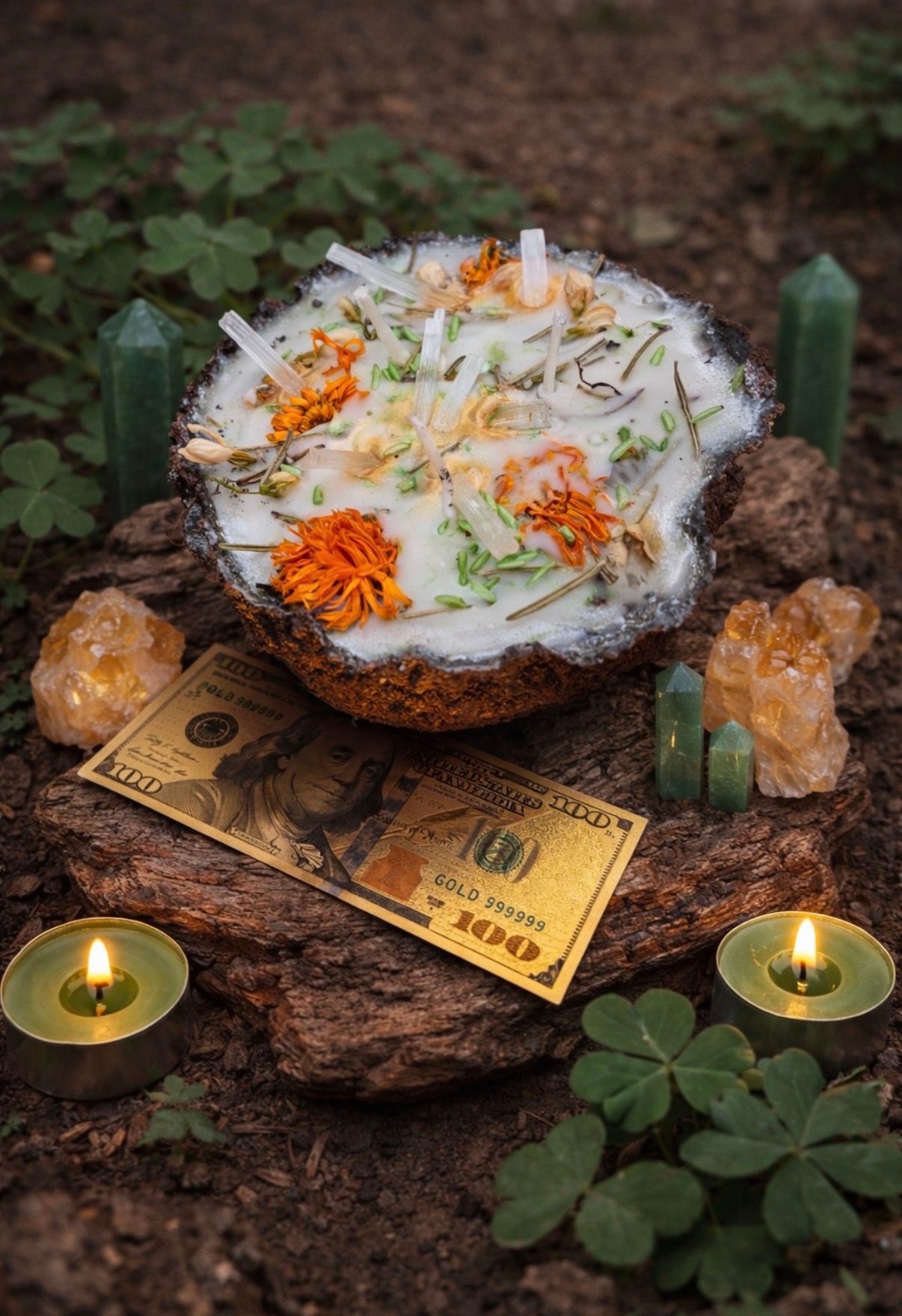 A sacred money-drawing candle crafted with the energy of the Earth, abundance, and intention.